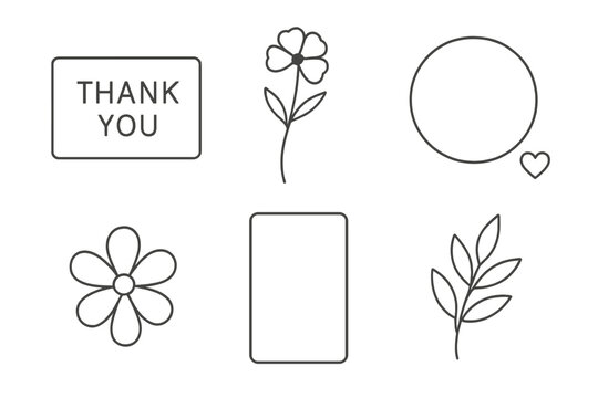 Minimalist floral and geometric icon set for scrapbooking, invitations, labels and stickers. Daisy, blossom, leaf branch, thank you badge, circle and rectangle shapes, vector illustration