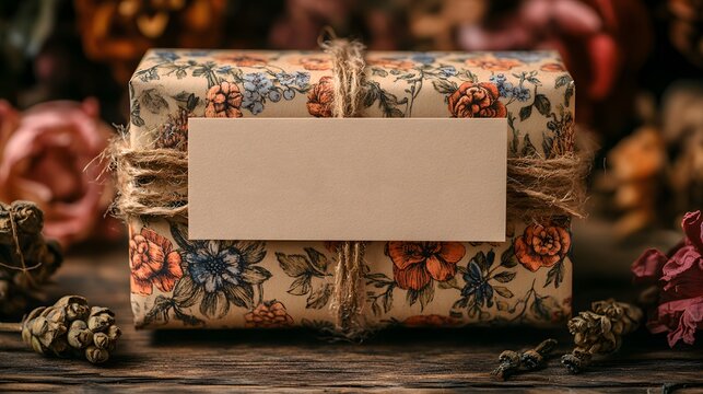Realistic thank you card mockup with botanical illustrations, placed on a wooden surface with soft natural light