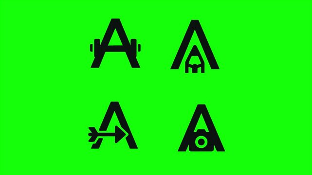 Animation showcases various creative interpretations of the letter "A" suitable for logo design. Incorporating elements of fitness, design, direction, and photography.