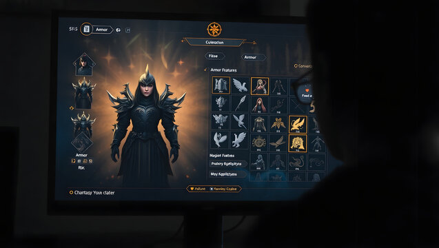 Gamer Customizing Character: A gamer meticulously tailors their character's appearance in a video game, selecting armor, weapons, and other details.