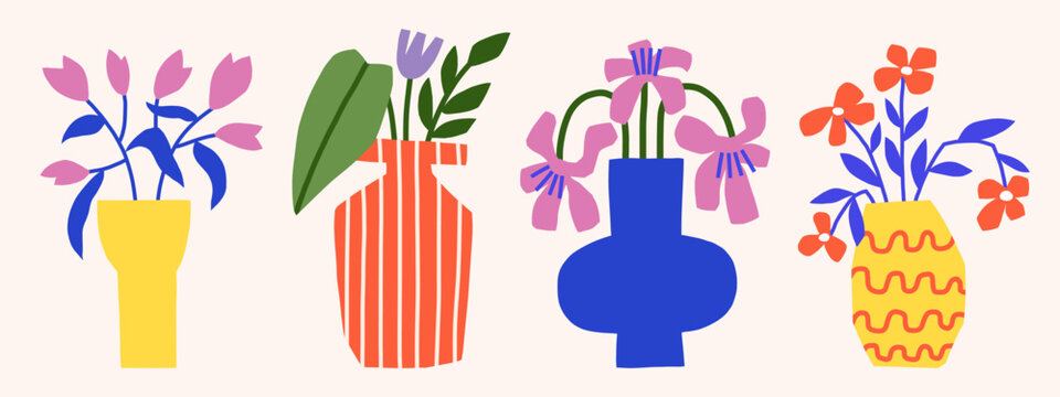 Bright flowers in vases vector illustration set. Trendy paper cut floral graphic. Flat botanical elements
