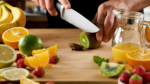 Chef cook cutting fresh apples for fruit salad on wooden cut board