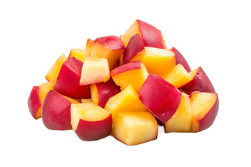A close up shot of a mango being cut into cubes with a knife showing the juicy texture of the fruit