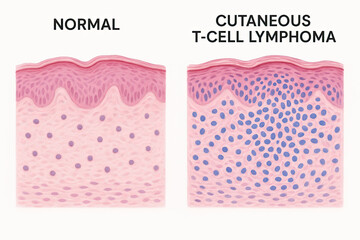 Medical illustration comparing normal skin tissue with tissue affected by cutaneous T-cell lymphoma.