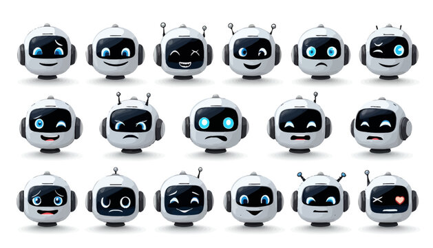 Robot emotions. Chatbot assistant emotions, cute ai symbol, tech mascot. Happy or sad funny face. Robotic machine high and low battery. Vector cartoon flat style isolated smile character illustration