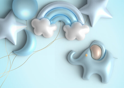 Baby shower invitation card with balloons shaped as elephant, rainbow, star and moon. Blue card template for boy birthday celebration