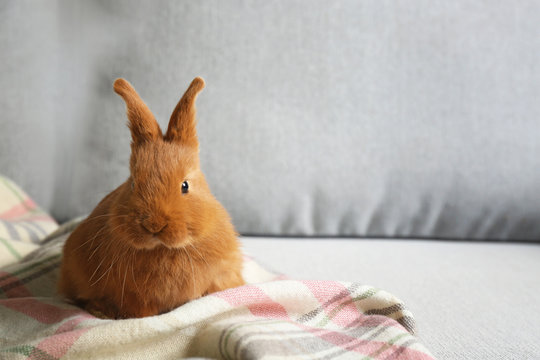 Cute red bunny sitting on light armchair