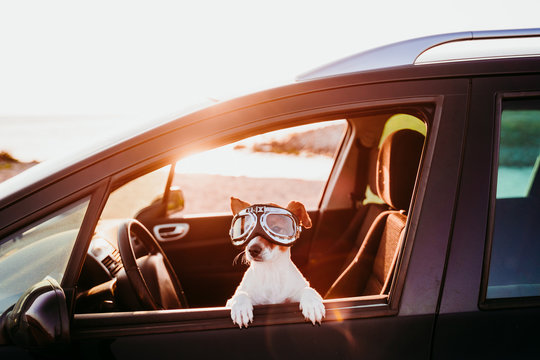 A pair of cute puppies peeks out of a car window. Pet Travel