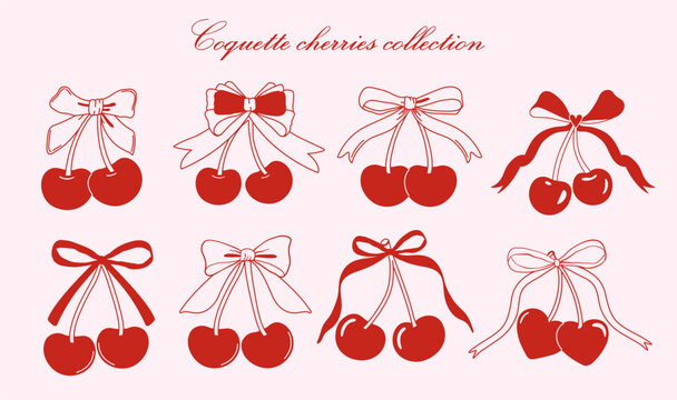 Set of coquette cherries with bow. Various cherry with ribbons. Vector illustration for posters, cards, logo, printing on t-shirt etc.