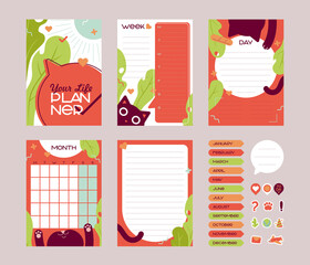 A set of Cute planner of your life with stickers. Cover, week, daily, month, for notes with leaves and a funny cat. Stickers for notes and reminders.
