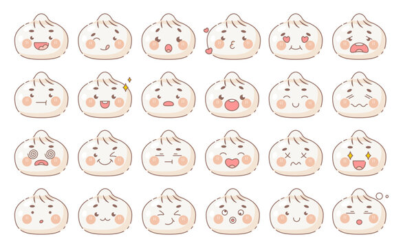 Dumplings fun face emoji icons set. Cute design emoticons sticker collection. Set of vector gyoza face emotions and feeling like happy, angry, sad, laughing, teasing and dizzy.
