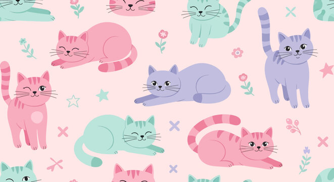 A cute and playful seamless pattern featuring cartoon cats in various poses. Perfect for children's fabric, prints, and wallpaper