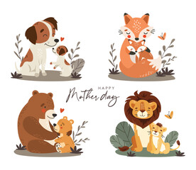 Set of сartoon animals with his baby. Collection of family cute pets child animals. Nice animals for Mother's Day. Mothers love. Vector illustration of moms and kids.