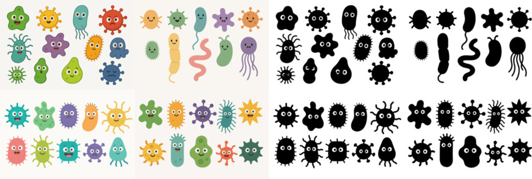 A vibrant collection of cute bacteria cartoon germs and friendly virus characters in a colorful illustration.