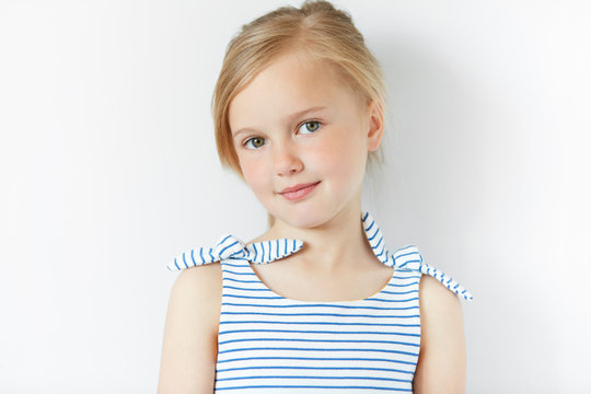 Portrait little young girl with blue eyes looking at camera. Young serious child looking at camera. Closeup. Indoors.  Sad little kid girl portrait looking.