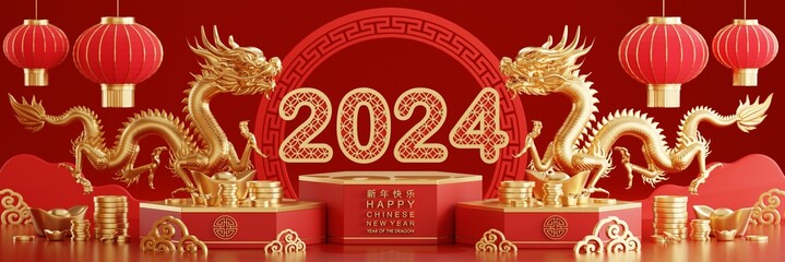 Furious mystical red dragon and Christmas decorations. Banner Chinese New Year of Dragon. Watercolor illustration