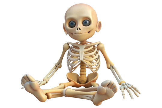 3D cartoon human skeleton sitting with labeled bones in plastic style, educational model for children on transparent background