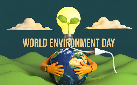 A cute cartoon Earth hugs itself with an unplugged lightbulb featuring a plant sprout for environment day
