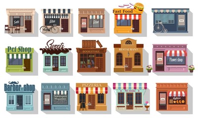 Set of pretty shops. Illustration of set of cute little shops and restaurants or boutiques. Cafe bistro and little shops. Big icon set on flat style