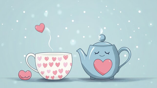 Cute cartoon teapot and teacup valentine's day greeting card, teapot and cup with heart trendy illustration. pour into cup