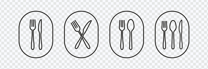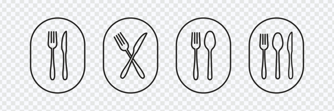 Fork, Spoon, Knife, and Plate Icon Set in Line and Flat Style, Cutlery icon set in line and flat style.