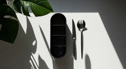 Minimalist black cutlery and lunchbox set on a white table with plant shadows.