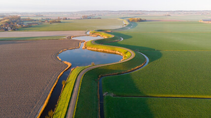 Aerial view of the winding Westfriese Dijk cutting through a vivid patchwork of green and brown fields, Warmenhuizen, Noord-Holland, Netherlands.