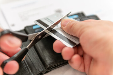 A close up of a person using a pair of scissors to cut up a bank credit card with a purse and credit card bills in the background.