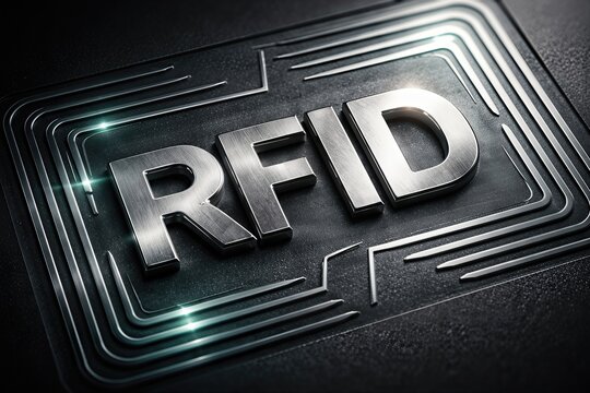 RFID technology system interface showcasing metallic branding with intricate design elements emphasizing digital security and automated identification solutions