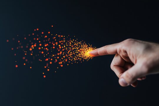 Features hand interacting with virtual interface, highlighting data visualization, digital transformation. Cutting edge technology, analytics are central to futuristic business scene