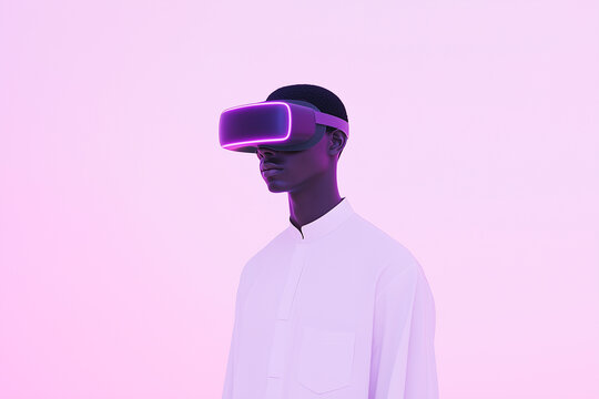 Experience the future with a young man exploring virtual reality using cutting edge VR headset technology in a vibrant neon environment