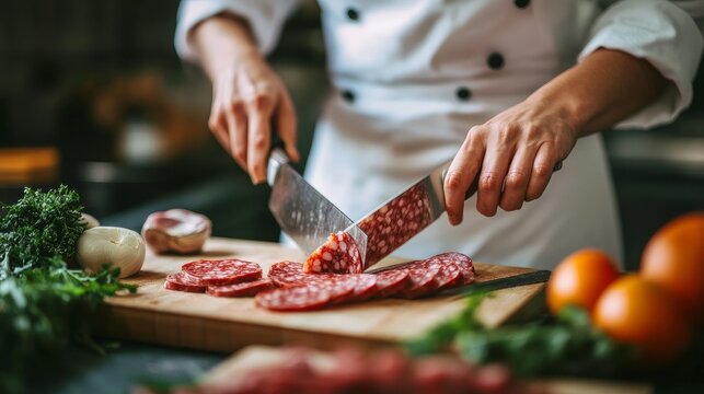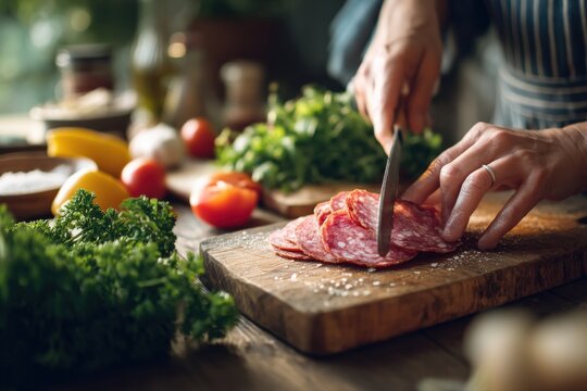 Close-up of a person's hands slicing salami on a rustic wooden board, surrounded by fresh vegetables and herbs.  A culinary scene full of warmth and deliciousness.