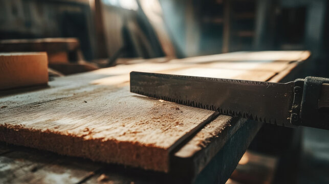A wood saw is actively cutting a wooden plank on a workbench, illuminated by soft light filtering through a window in the workshop