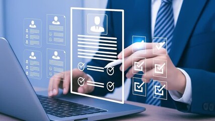 Digital Recruitment Process: Professional Selecting Candidates with Virtual CVs and Checklists on Laptop, Modern HR Management Concept