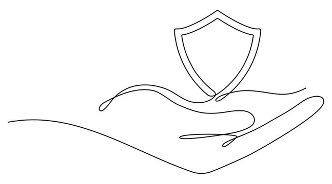 Hand holds shield badge continuous line drawing. Guard protect linear symbol. Vector illustration isolated on white.