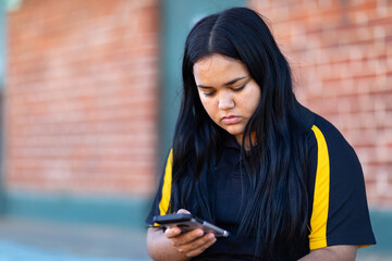 Upset girl sitting in the dark while using her smartphone. The light from the screen is illuminating her face.