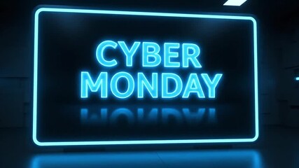 Bright neon sign glowing CYBER MONDAY in a dark, modern space, reflecting on a sleek surface.