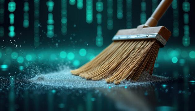 Broom sweeps glowing digital dust on dark background. Conceptual image of data cleaning, system maintenance. Cyber hygiene abstract. Metaphor of removing outdated tech for innovative transformation.