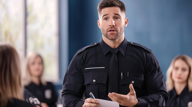 Cyberbullying Protection Concept, Police Officer Delivering an Educational Talk on Cybercrime Awareness to Engage the Community and Enhance Public Knowledge on Safety and Security Measures