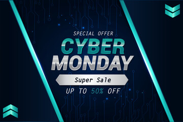 Sale banner template design with blue light effect on dark background, Cyber Monday special offer sale up to 50% off.