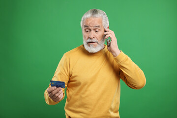 Confused senior man with credit card talking on smartphone against green background. Be careful - fraud