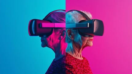 Elderly woman experiencing virtual reality, showcasing technology's impact on seniors in a vibrant and colorful setting.