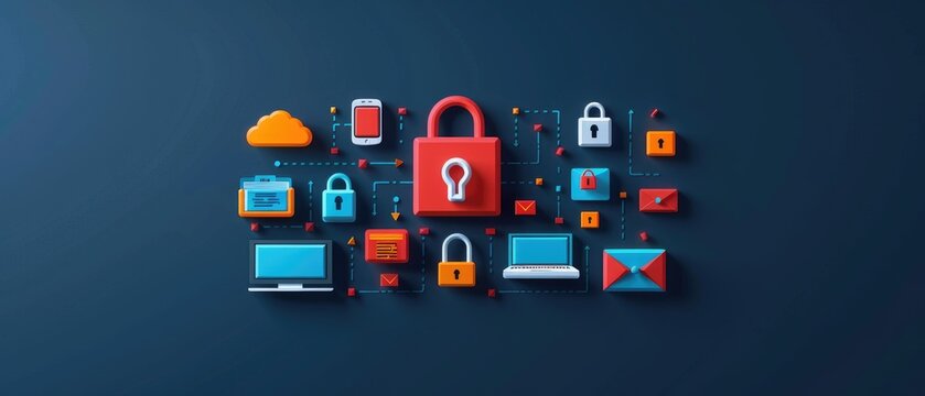 Digital Security Icons, a colorful array of symbols representing cybersecurity concepts such as padlocks, devices, and encrypted communication in a modern style.