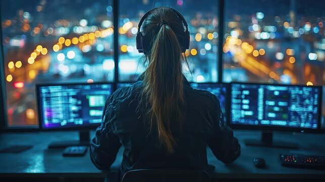 A man wearing a hooded jacket is actively engaged with a laptop, A cyber threat hunter searching for signs of malicious activity