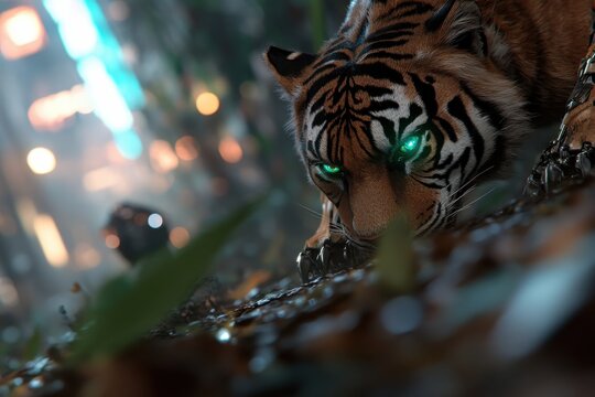 A cyber-enhanced tiger crouches low in a digital forest, its glowing green eyes scanning the environment, showing its fusion of nature and technology seamlessly.
