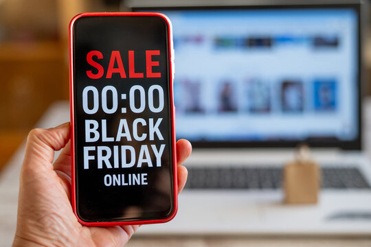 Hand holding smartphone displaying black friday online sale countdown, with laptop featuring shopping website in background, highlighting online shopping and discounts