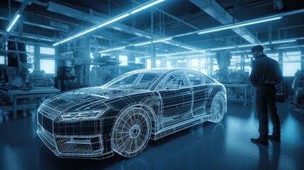 AI powered robotic mechanic using laser technology to perform intricate repairs on a car engine in a neon lit high tech workshop with concrete floors and metallic textures