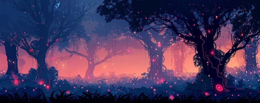 A cybernetic forest where trees are intertwined with metallic vines and glowing circuitry, creating an otherworldly biome.   illustration.