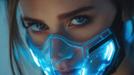 A young woman, possibly of mixed ethnicity, wears an augmented reality mask with neon lights and holographic displays. The setting is futuristic with a cyberpunk theme, likely at night, creating a