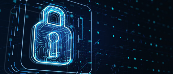 Cyber security and privacy protection concept with digital blue closed padlock symbol in frame on dark technological background with place for your advertising text or logo brand. 3D rendering, mockup